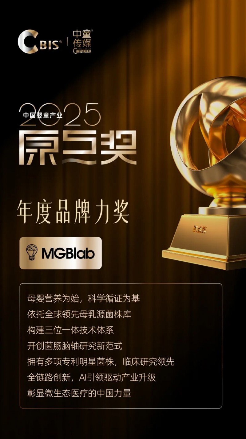 CBIS中国婴童产业大会作为国内婴童行业极具权威性与影响力的年度盛会,原点奖更是被视为产业发展的风向标与价值标杆。本次大会吸引了来自全球的行业领袖、科研专家、渠道标杆及品牌代表齐聚一堂,共同探讨行业发展新机遇、新方向。本届原点奖评选聚焦品牌创新力、科研实力与产业贡献,MGBlab以其在母乳源益生菌与菌肠脑轴研究领域的系统性突破,赢得评审团一致认可。