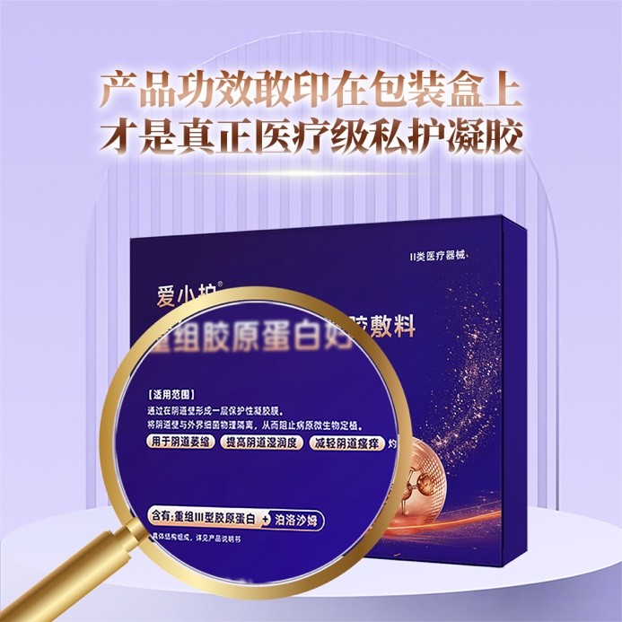 1. 爱小护重组胶原蛋白妇科凝胶敷料(爱小护医用胶原私护凝胶)【5000家线下医疗机构合作,功效能直接写在包装盒上】