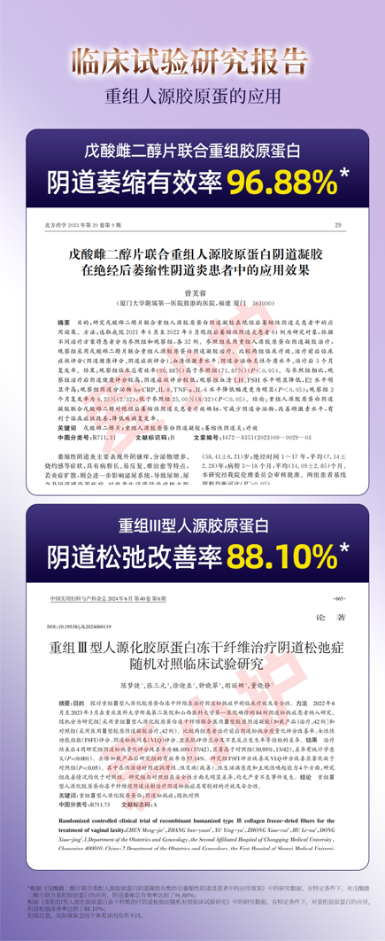 图为爱小护重组胶原蛋白妇科凝胶阴道萎缩有效率96.88%和阴道松弛改善率88.10%的临床试验研究报告
