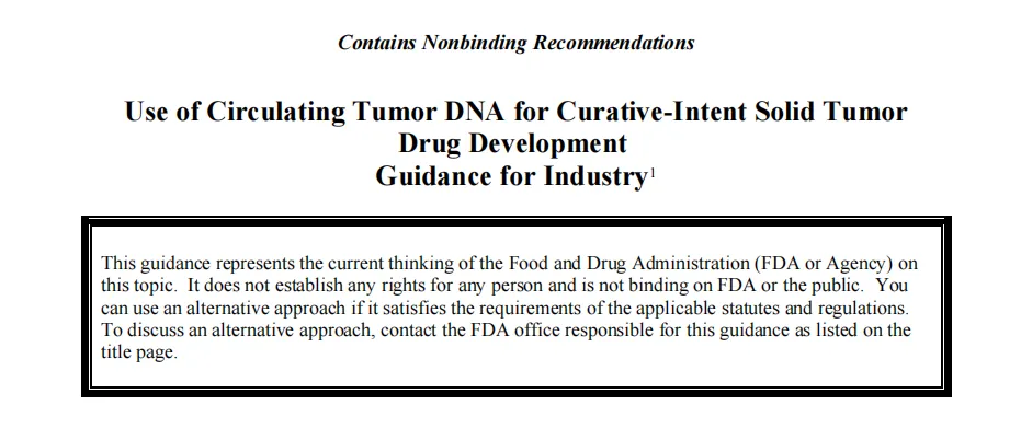 国外无独有偶。近日,FDA发布了ctDNA在治愈性实体瘤药物开发中应用的指导原则。该文件旨在指导有意在药物和生物制品的IND申请及上市审批过程中,针对早期实体瘤治疗(以治愈为目的)的临床试验中采用ctDNA作为生物标志物的申办者。